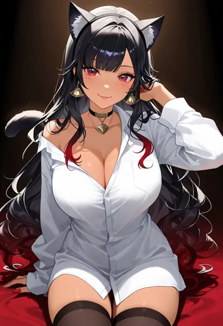 고양이: 검은 털과 흰색 안감이 있는 고양이 귀 헤어밴드, 이마를 가리는 층층이 진 길고 파 волн 모양의 검은 머리카락, 은색 종이 달린 검은 초커, 드레스로 입은 oversized 흰색 버튼업 셔츠, 허벅지 긴 검은 스타킹, 보이는 검은 고양이 꼬리
