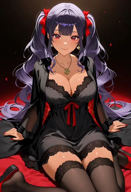 야간 복장: 길고 파 волн 모양의 어두운 보라색 머리카락을 쌍둥이 꼬리로 묶음, 깊은 네크라인의 검은 레이스 장식된 야간 복장, 가슴에 작은 빨간 리본 리본, 투명한 검은 로브에 흐르는 소매, 레이스 상단이 있는 검은 허벅지 긴 스타킹, 빨간 슬리퍼, 작은 펜던트가 달린 목걸이