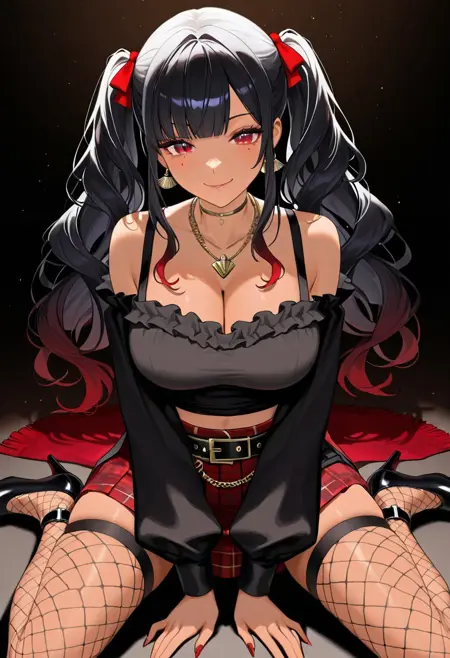 쌍꼬리: 빨간 끝이 있는 긴 검은 머리카락, 빨간 머리끈으로 묶은 쌍꼬리 헤어스타일, 곧은 앞머리, 붉은 눈, 프릴이 있는 어깨를 드러낸 검은 크롭탑, 긴 분리형 소매, 레이스 디자인이 있는 검은 초커 목걸이, 계층적인 은색 목걸이, 검은 벨트가 있는 빨간 체크 플리츠 미니 스커트, 벨트 체인과 금속 링, 피시넷 스타킹, 발목 끈이 있는 검은 하이힐