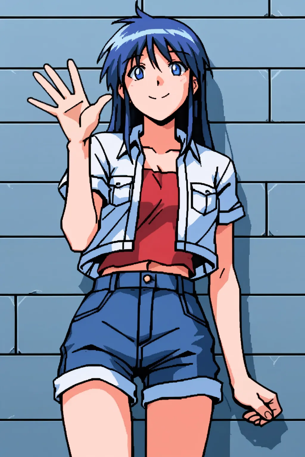 ViperV8Crea、デニムショートパンツ、オープンな短めのキャミソール付き白いジャケット、赤いシャツ、