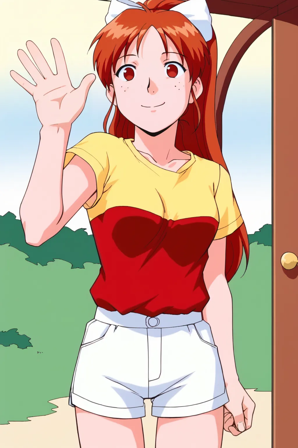 ViperV8Betty, freckles, hair bow, yellow and red tucked in t-shirt, white short shorts,