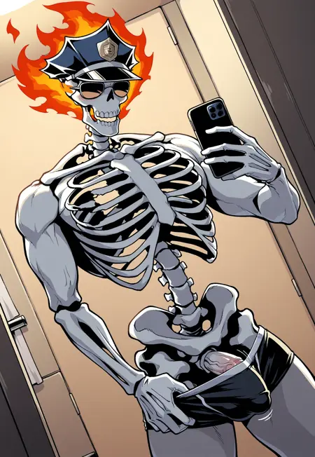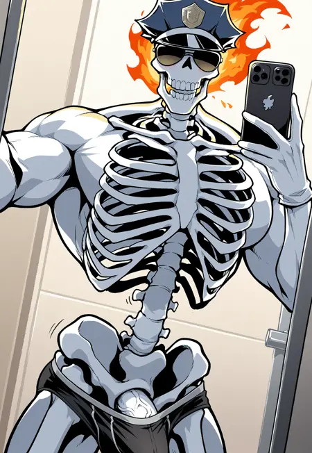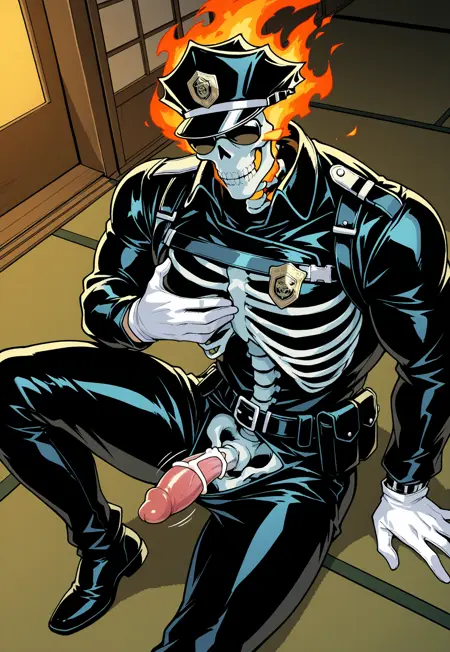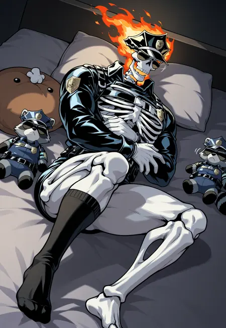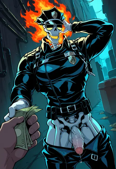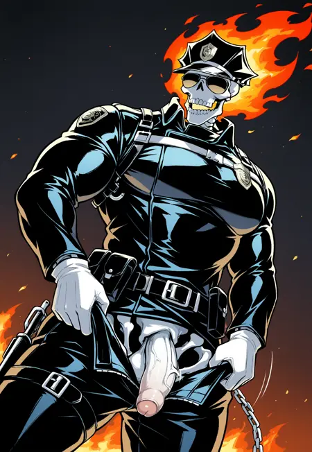 Skeleton, Skeleton body, police cap, the skeleton of the forearm under the sleeve, white gloves, chains on the hands, Fire around the head, Fire on the head, sunglasses,