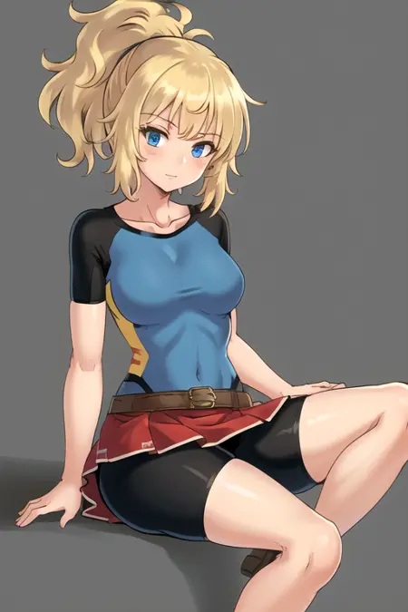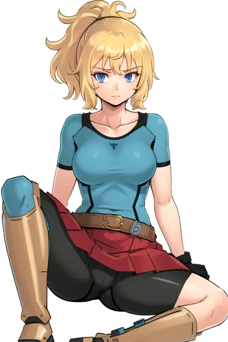 SolveigKunagachi, 1girl, solo, long hair, blue eyes, miniskirt, blonde hair, blue shirt, medium breasts, collarbone, ponytail, short sleeves, brown belt, bodysuit, red skirt, scrunchie, knee boots, high ponytail, bike shorts, skin tight