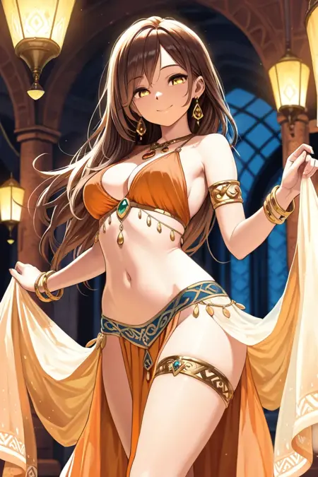 harem dancer , veil, jewelry, bracelets, earrings, sheer fabric, see-through fabric, golden accessories, flowing fabric, exposed midriff, anklets