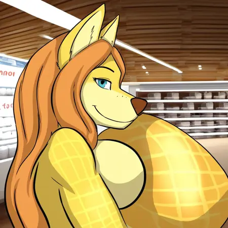 1girl, solo, waffle wolf, furry female, wolf, animal nose, blu eyes, orange hair, long hair, light yellow fur, multicolored fur, tail,
