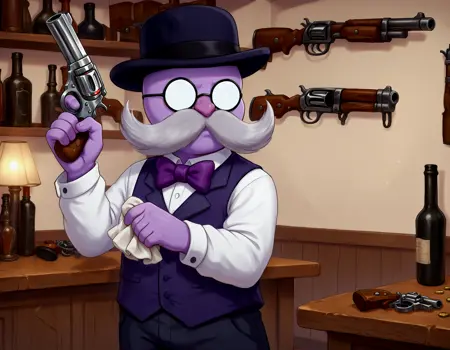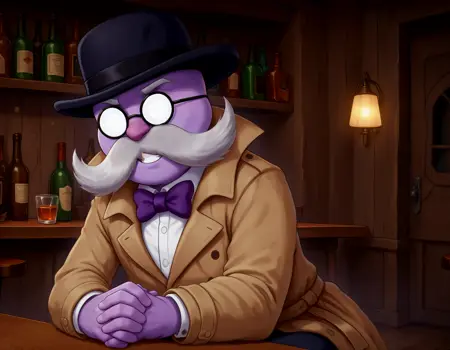 1boy, solo, purple skin, no eyes, no eyebrows, round eyewear, pince-nez, opaque glasses, handlebar mustache, obese, cleft chin, white collared shirt, purple bowtie, purple waistcoat, bowler hat, dress pants,