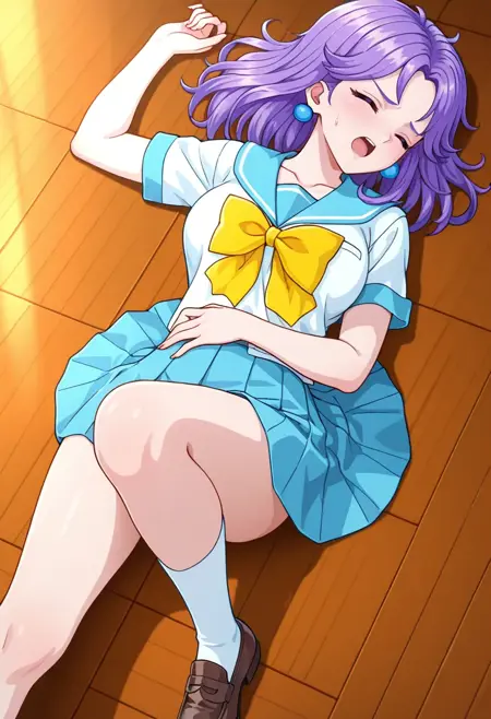 学ラン:ジュエリー、ピンクのイヤリング、球形イヤリング、青いセーラー襟、青いシャツ、青いスカート、長袖、学ラン、セラフク、プリーツスカート、黄色いリボン、白いソックス、ローファー