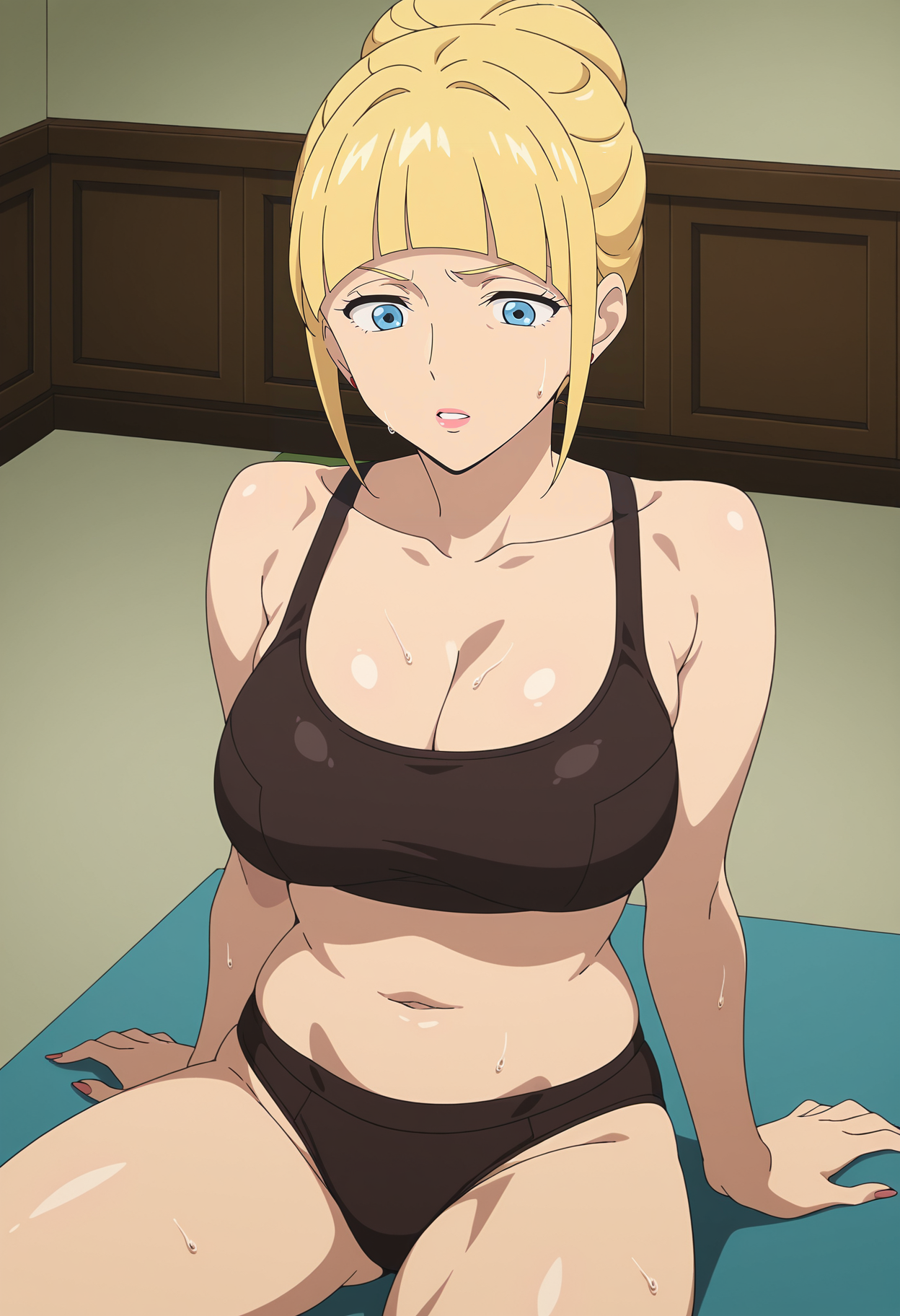 mm,mature female,blonde hair,blue eyes,hair bun,single hair bun,bangs,lipstick,anime coloring