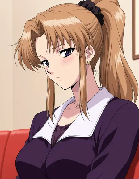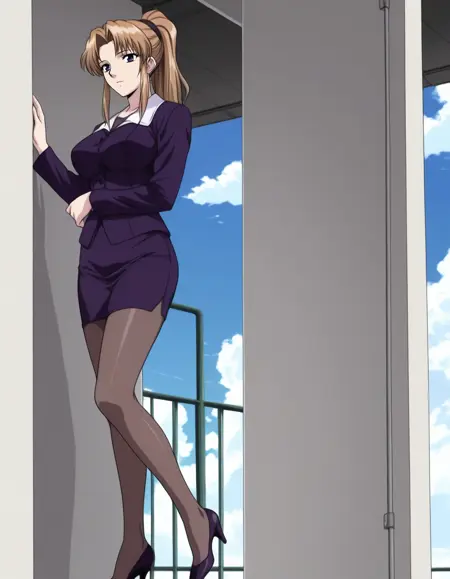 mai_hgteacher,anime_coloring,1990s \(style\),mature_female,(aged_up:1.5),long_legs,long_hair,ponytail,brown_hair,blue_eyes,earrings,purple_eyes,skirt_suit,pantyhose,red_high_heels