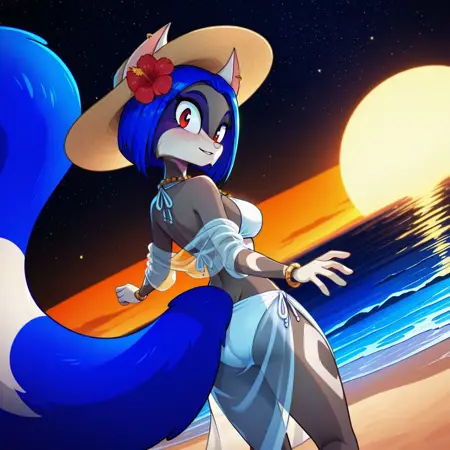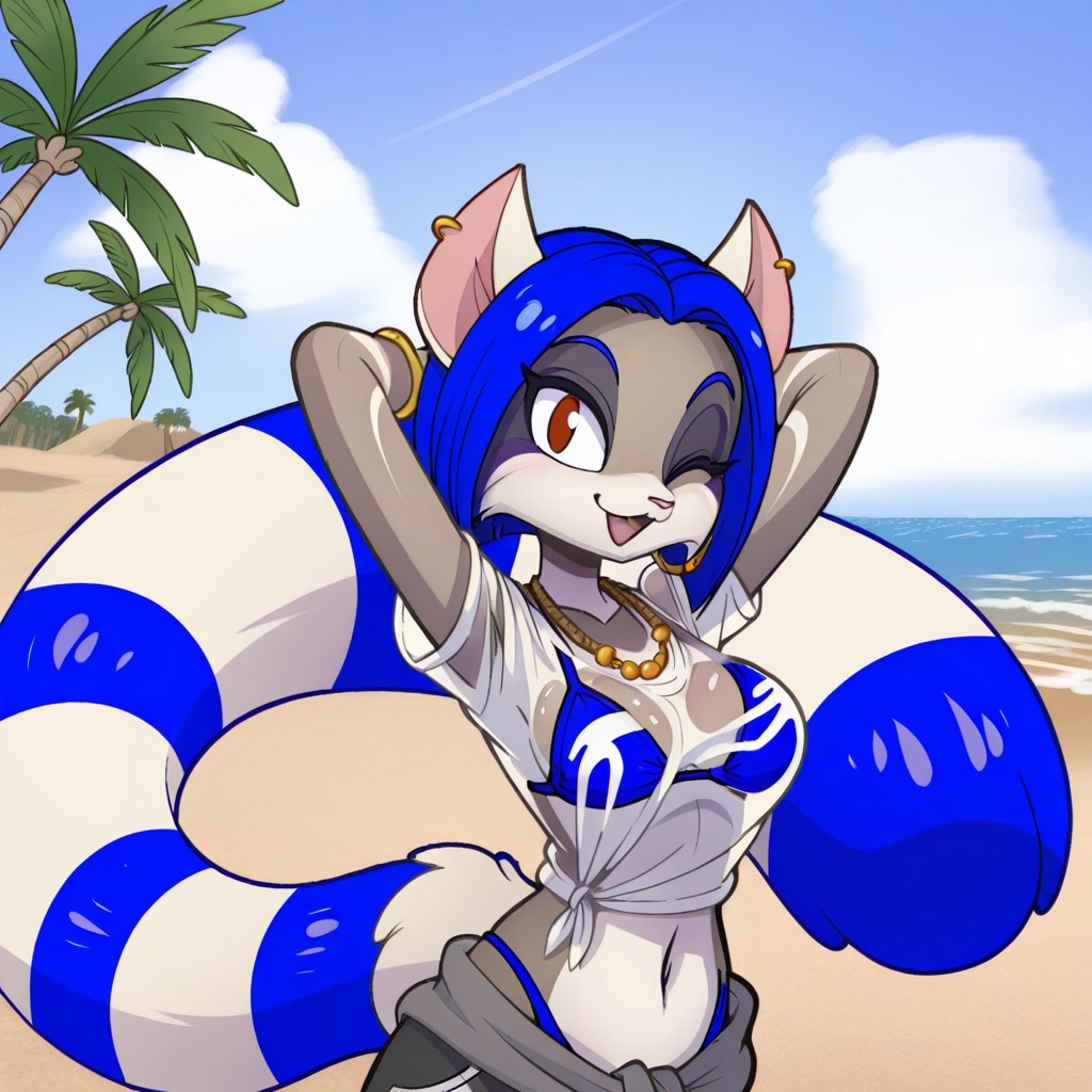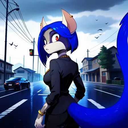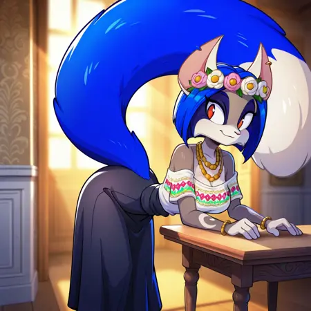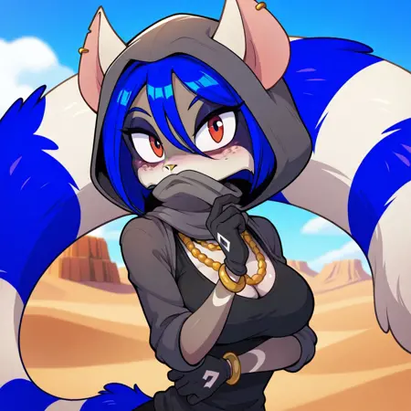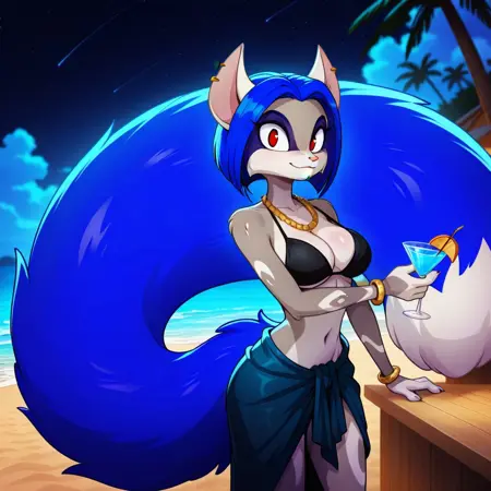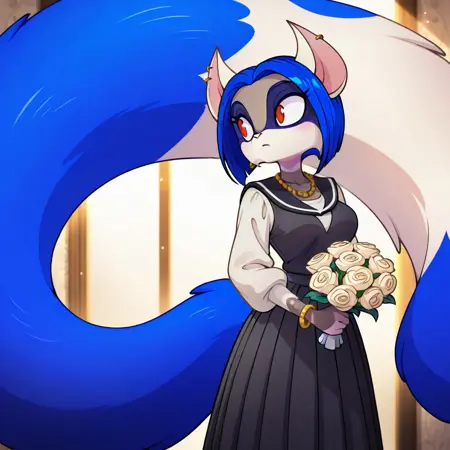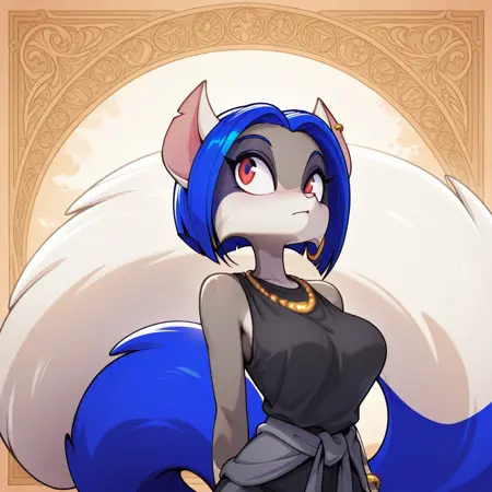au_dk, 1girl, solo, furry, furry female, animal ears, animal nose, tail, huge tail, short hair, red eyes, body fur, white fur, blue fur, two-tone fur, eyeshadow, breasts, snout, blue hair,