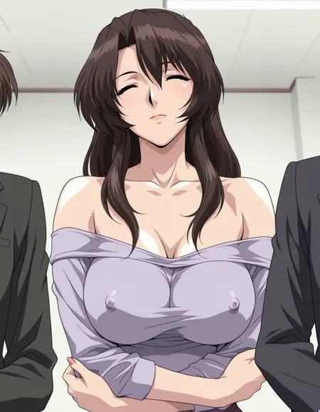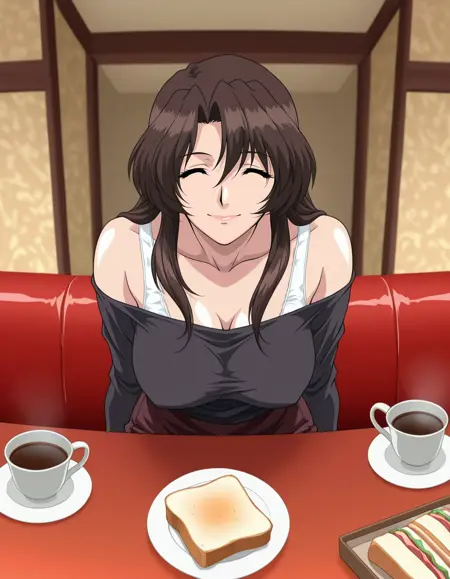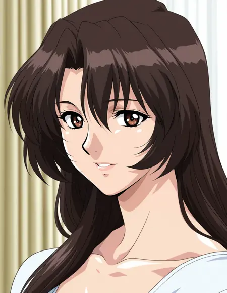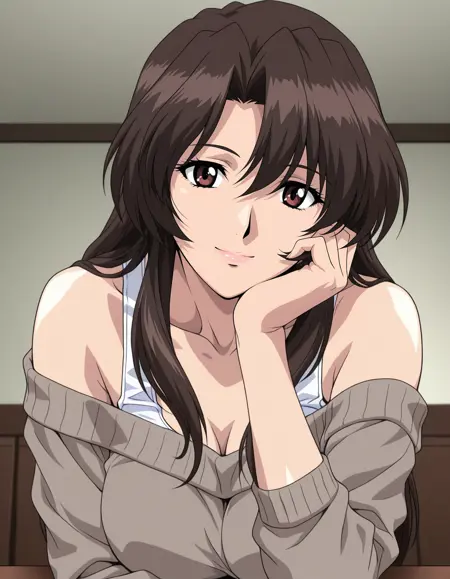 mai_misako_asakura,anime_coloring,1990s_\(style\),mature_female,(aged_up:1.5),long_hair,breasts,brown_hair,lipstick,off-shoulder_shirt,black_shirt,bra_strap,red_pencil_skirt,high_heels