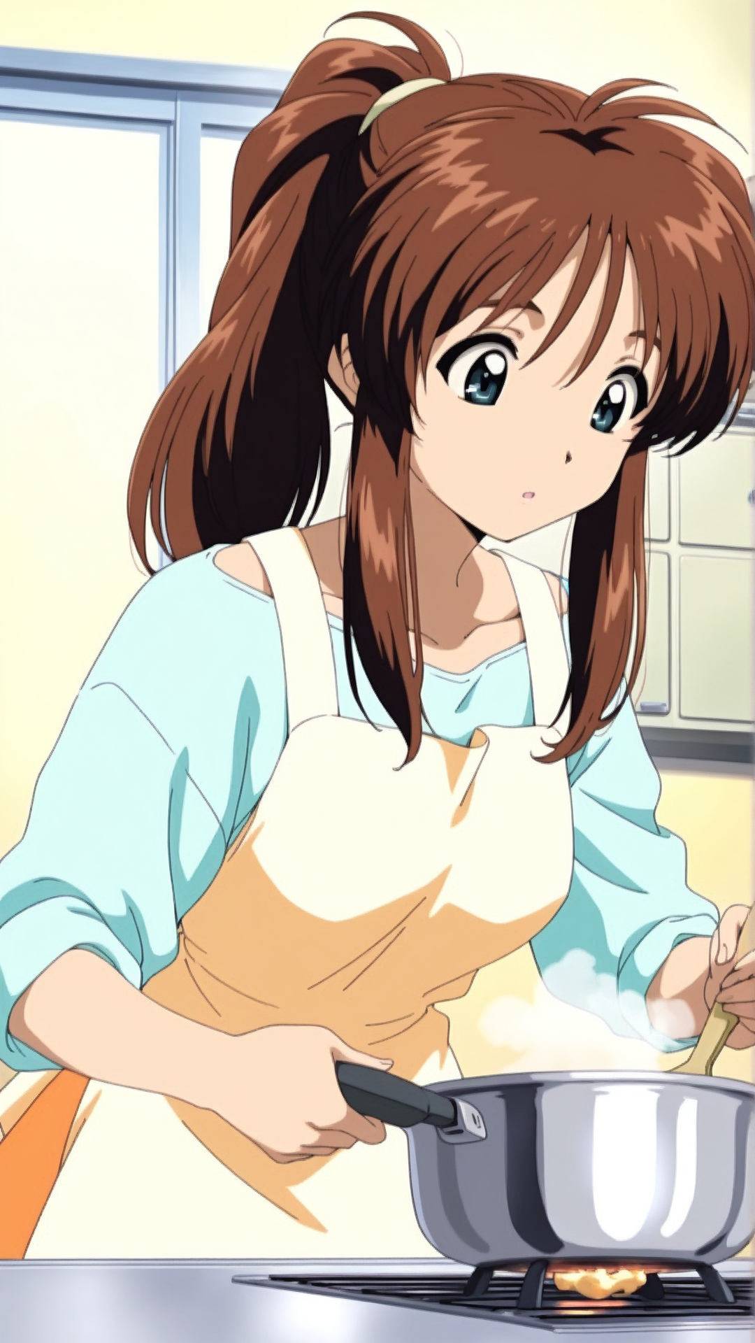 복장: 파란 셔츠, 앞치마, 주황 치마,