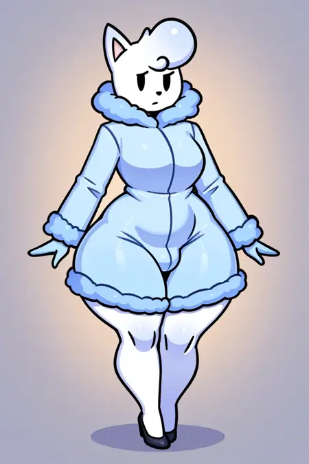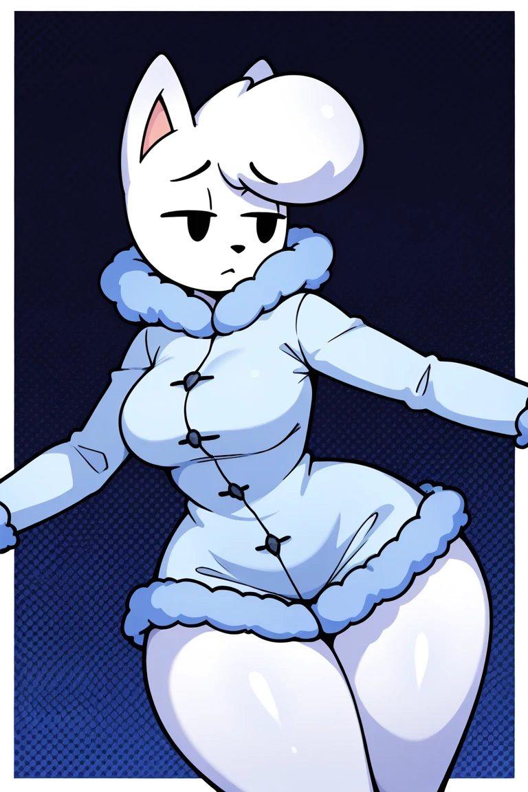 CyeFNF, white fur that has a light blue shade, long periwinkle coat, black eyes, no sclera, short, chibi