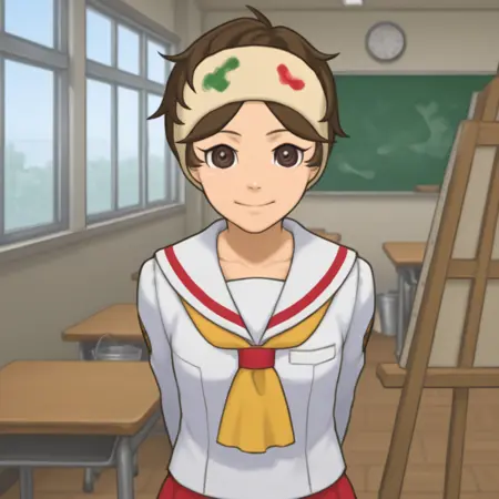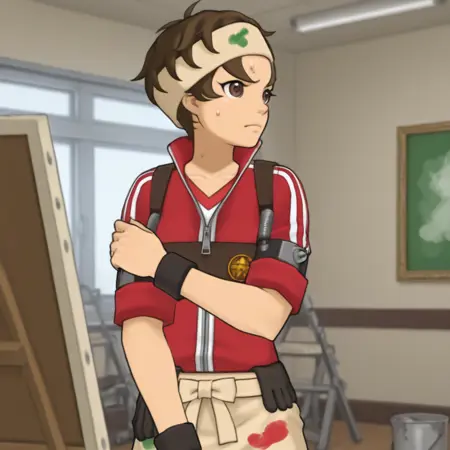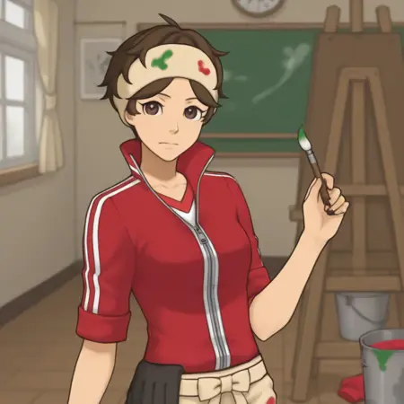 Outfit Tags: red track suit, sleeves rolled up, waist apron, headband, paint stains, unworn gloves