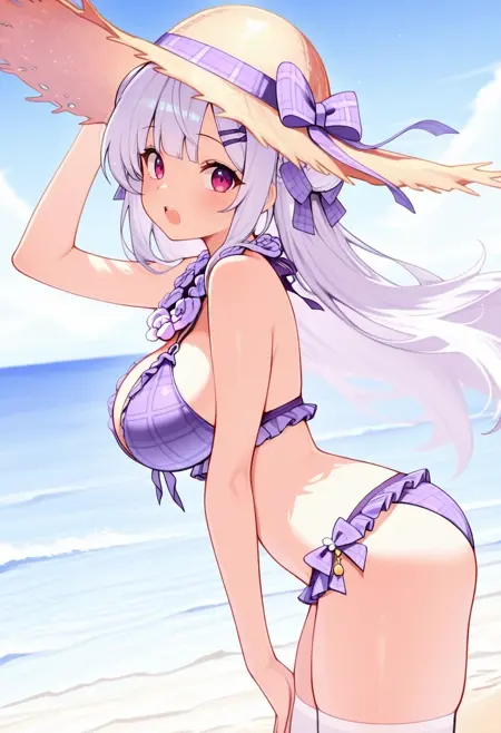 straw hat,purple bikini,frilled bikini,plaid bikini,flower necklace,hair bow,plaid bow,