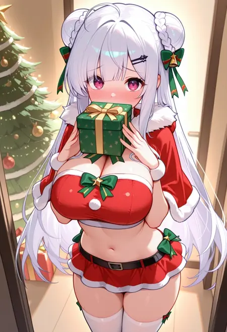 santa costume,microskirt,fur trim,white thighhighs,crop top,green bow,plated bow,