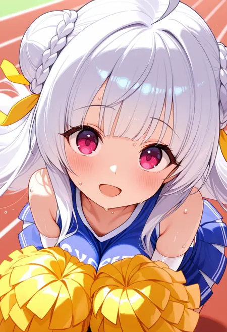pom pom \(cheerleading\),elbow gloves,white thighhighs,purple skirt,belt,yellow ribbon,
