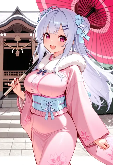 pink kimono,japanese clothes,fur trim,oil-paper umbrella,light blue obi,light blue bow,