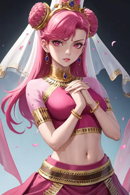 默认:parvati,粉红色眼睛,面纱,珠宝,耳环,手镯,短上衣,腰部,肚脐