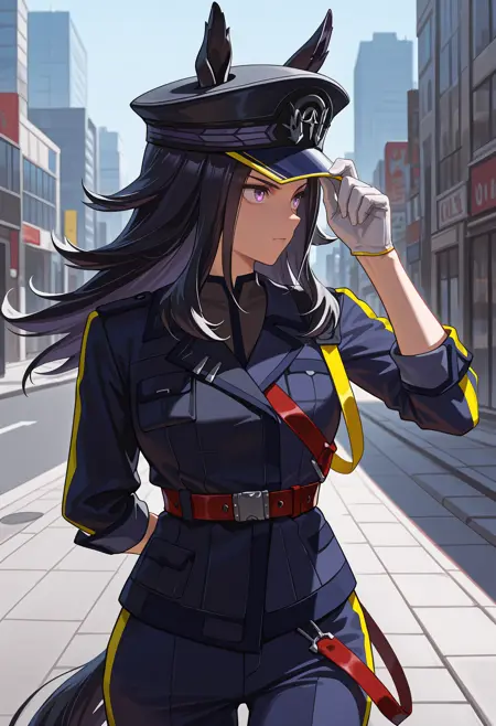 Default Outfit: black headwear, peaked cap, ears through headwear, two-tone jacket, black jacket, dark blue jacket, sleeves past elbows, white gloves, red belt, dark blue pants