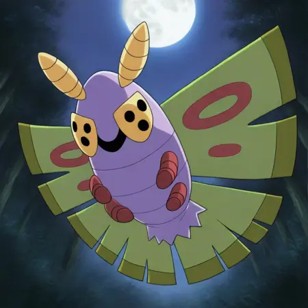 Dustox_pkmn, purple body, green wings, red accents, yellow antennae, red legs, moth