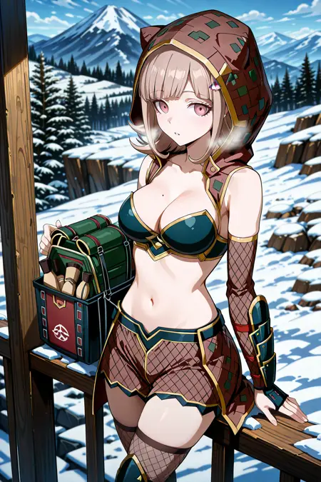 치아키: nanami_chiaki, asuka_zero, danganronpa_(series), alternate_costume, 1girl, solo, medium_hair, brown_hair, pink_eyes, japanese_armor, red_armor, lamellar_armor, shoulder_armor, arm_guards, leg_armor, fishnet_stockings, fishnet_clothing, thigh_highs, exposed_shoulders, midriff, navel, tassets, ninja, armor_skirt, segmented_skirt, mon_(crest), clan_symbol, breasts, medium_breasts, cleavage, bikini_armor, mole_on_breast, hood_up, hair_ornament, hairclip, galaga, green_crest, green_mon
