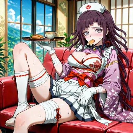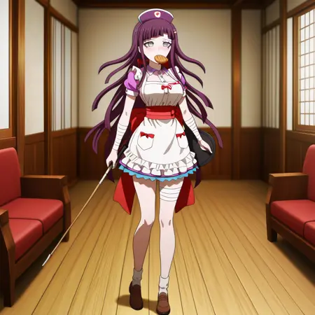 아오이: asuka_zero, 1girl, alternate_costume, apron, bandaged_arm, bandaged_leg, bandages, beauty_mark, blush, cleavage, collaboration, colorful, crossover, danganronpa_(series), facial_mark, grey_eyes, japanese_clothes, kimono_print, long_hair, medical_gloves, nurse, nurse_cap, nurse_uniform, obi, official_art, pleated_skirt, purple_hair, red_sash, sash, short_sleeves, solo, traditional_japanese, tsumiki_mikan, white_apron, white_footwear, white_gloves, white_hat, white_socks