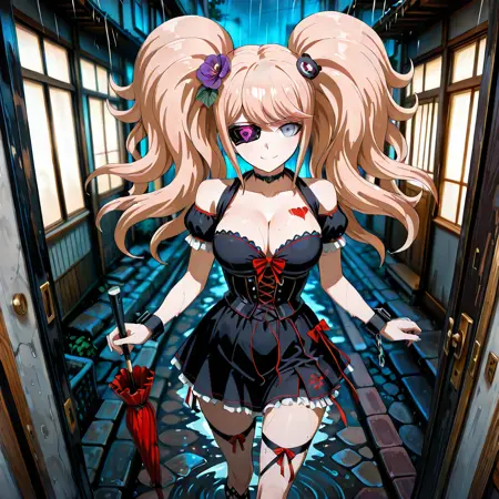 준코: asuka_zero, 1girl, solo, alternate_costume, bear_hair_ornament, gothic_lolita, black_choker, black_dress, blonde_hair, chains, choker, cleavage, corset, danganronpa_(series), enoshima_junko, eyepatch, frills, gothic_aesthetic, hair_ornament, lace, lace_trim, light_blue_eyes, long_hair, low-cut_dress, puffy_sleeves, short_sleeves, slight_smile, tattoo, thorns, twin_tails, hair_flower, hair_ornament, purple_flower