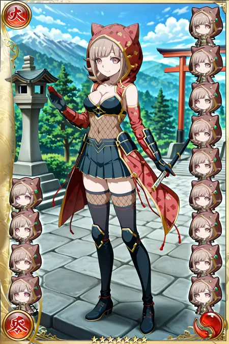 치아키: nanami_chiaki, asuka_zero, danganronpa_(series), alternate_costume, 1girl, solo, chibi, sprite, game_sprite, short_hair, brown_hair, pink_eyes, japanese_armor, samurai, sengoku_period, red_armor, lamellar_armor, shoulder_armor, arm_guards, kusazuri, armor_skirt, mon_(crest), family_crest, green_crest, hood, hooded, fishnet_stockings, black_legwear, thigh_highs, boots, black_footwear, collaboration, crossover, official_art, red_hood, animal_hood, hood_up, hair_ornament, hairclip, galaga, smile