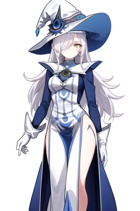 SilentMagician, 1girl, witch hat, long hair, solo, hip vent, blue dress, white gloves, white hair, medium breasts, long dress, hair over one eye, yellow eyes, side slit, long sleeves