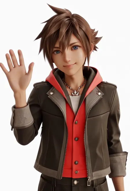 提示词:杰作,最佳画质,(动漫着色:1.2),3D,写实,1个男孩,单独,瘦削,纤细,苗条,修长,年轻,sora kh4,蓝眼睛,短发,棕发,尖刺发型,黑色夹克,红色兜帽,红色连帽衫,白色衬衫,黑色长裤,银色王冠项链,细致的眼睛,引人注目的男孩,可爱,非常可爱,讨人喜欢,柔软身体,肖像,注视观众,微笑,手臂垂于身侧,手臂抬起挥手,手掌张开,白色背景