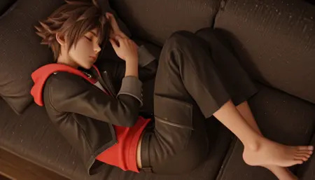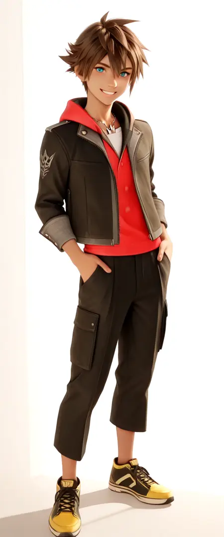 sora kh4,蓝眼睛,短发,棕发,尖刺发型,黑色夹克,红色兜帽,红色连帽衫,白色衬衫,黑色长裤,银色王冠项链,黑黄配色鞋子,黑黄配色鞋履