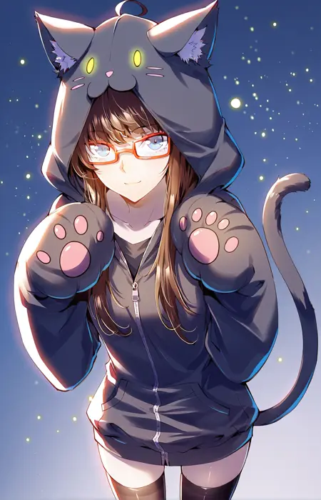 Zhuqing_outfit、黒いフーディー、フード付きフーディー、ジッパー付きフーディー、猫の耳、猫の顔、肉球の袖、フーディーの裾模様、黒いインナー、黒いタイツ、タイツ、猫の尾