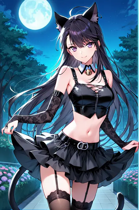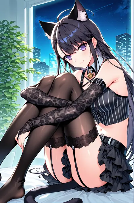 Speedgod_outfit、白いカラー、取り外し可能カラー、ベルカラー、ノースリーブトップ、黒いトップ、ショートトップ、ストライプトップ、お腹の部分、黒いストラップ、ストライプトップ、肩ストラップ、バックルストラップ、黒いスカート、レイヤードスカート、黒いベルト、銀色のバックル、ブライダルガントレット、レースブライダルガントレット、黒いタイツ、太ももガーター、ガーターストラップ、猫の尾