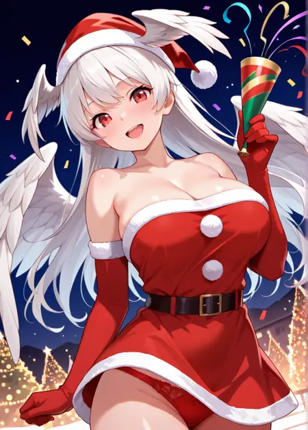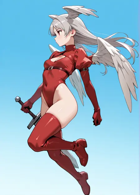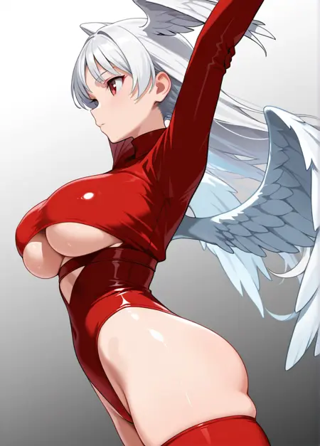 ultimaxd, 1girl, head wings, long hair, wings, grey hair, red eyes, lips