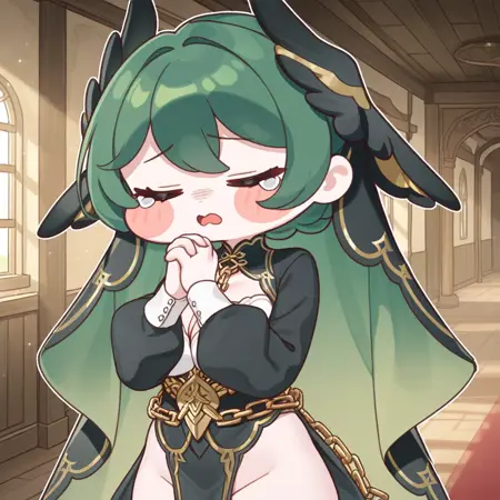 태그: 1소녀, 빨간 눈, 녹색 머리카락, 큰 가슴, 흰색 허벅지 양말, 체인, 검은 드레스, 골반 커튼, 긴 소매, 머리 날개, 젖가슴 노출, 베일, 땋은 헤어볼, 치비, 뺨 빨개 스티커