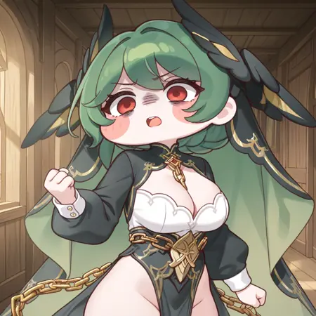 标签:1个女孩,红眼睛,绿发,大乳房,白色过膝袜,链条,黑色连衣裙,骨盆帘,长袖,头部翅膀,深V,面纱,编发髻,Q版,腮红贴纸