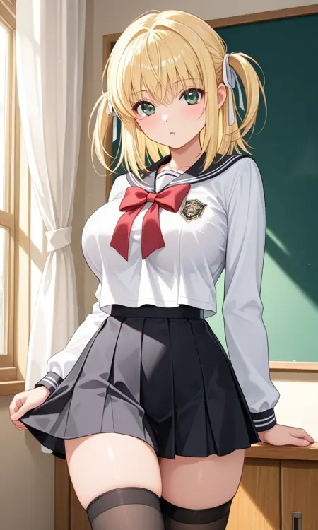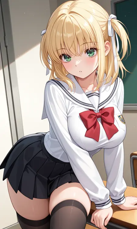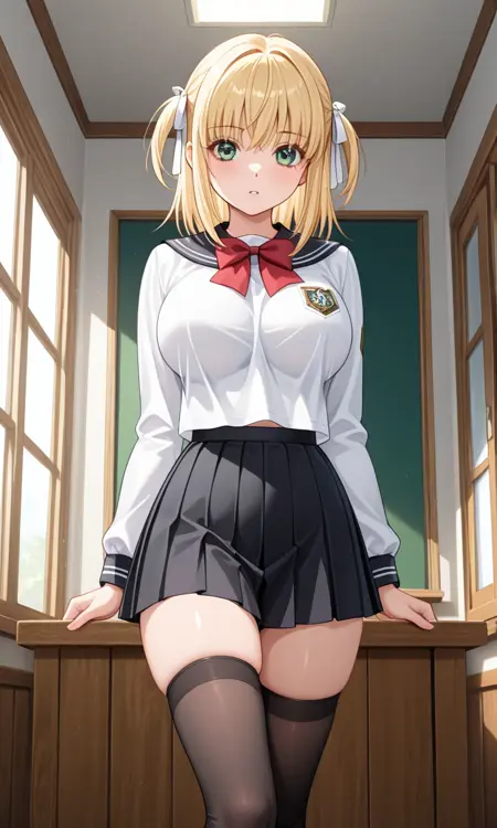 Alhara Youko (Shuukyuu Shoujo), medium hair, hair between eyes, Little twintails, Little twintails tied with small white ribbons, medium locks in the front of the side of the hair, blonde hair, green eyes, large breasts, thighs, long sleeve shirt, white long sleeve shirt, school uniform, white school uniform, red bow tie, skirt, black skirt, short skirt, black short skirt, thigh high socks, black thigh high socks