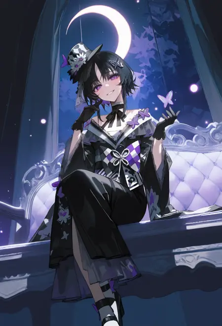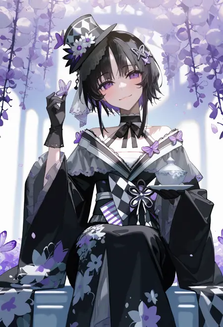 hoshomago, 1girl, solo, black hair, short hair, purple eyes, lolita fashion, black kimono, long sleeves, wide sleeves, frills, checkered clothes, black headwear, top hat, mini hat, hat flower, hair ornament, black ribbon, neck ribbon, black gloves, obi, bug, butterfly, purple butterfly, floral print, butterfly print, black footwear