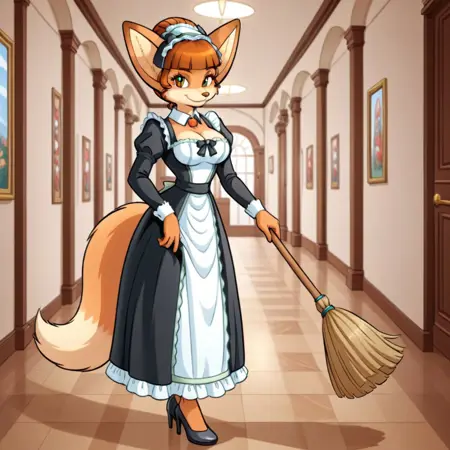 foxgirl, fennec fox, red and tan fur, brown hair, single hair bun, blunt bangs, brown eyes, Brown nose, large ears, fox tail, large breasts,