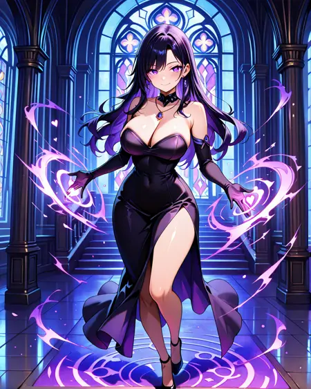 她通常身着一件诱惑却灵活的黑色紧身胸衣裙,适合潜行、诱惑或战斗。其标志性配饰包括一条紫色宝石项链和长手套,融合了哥特式与现代妖姬美学。