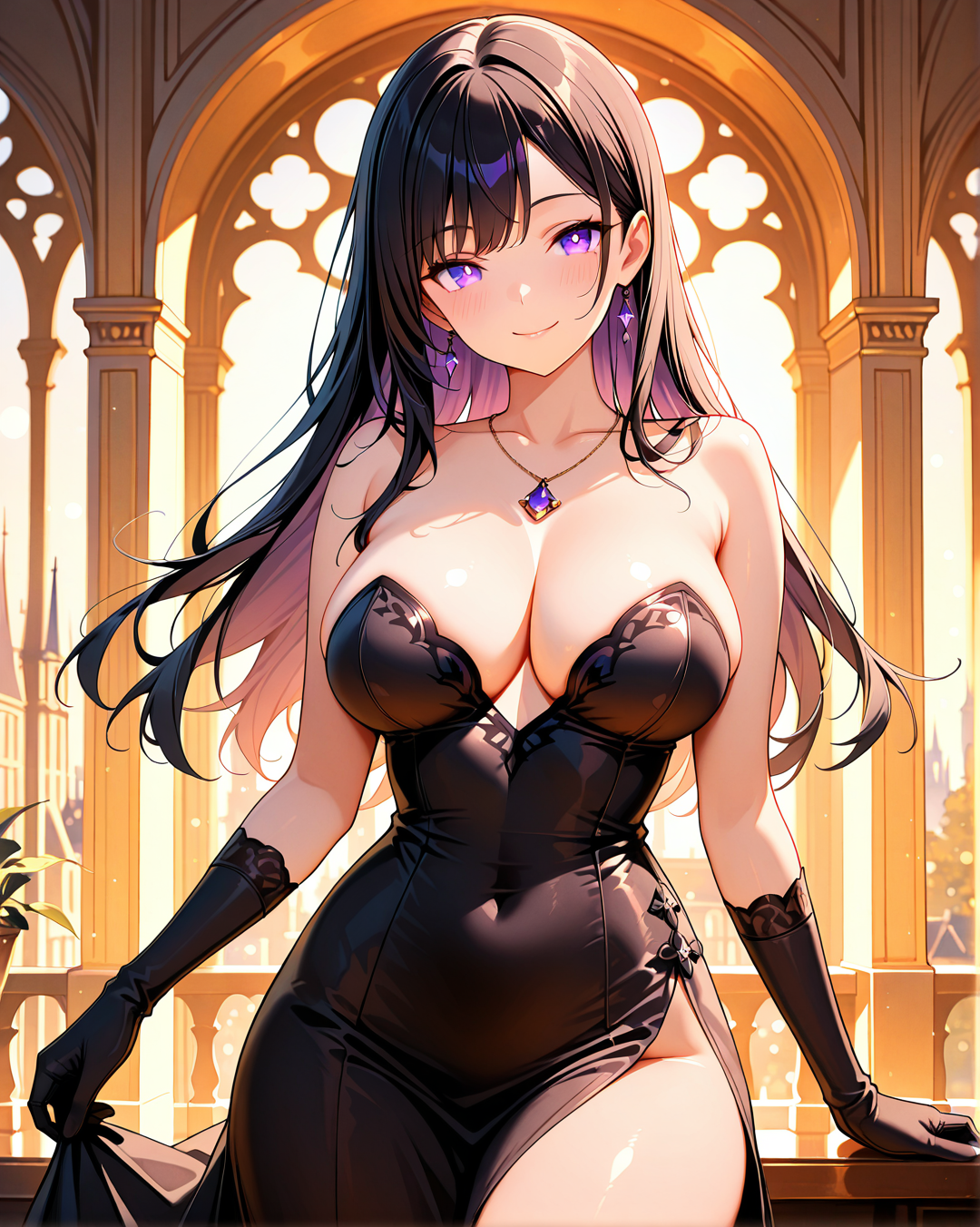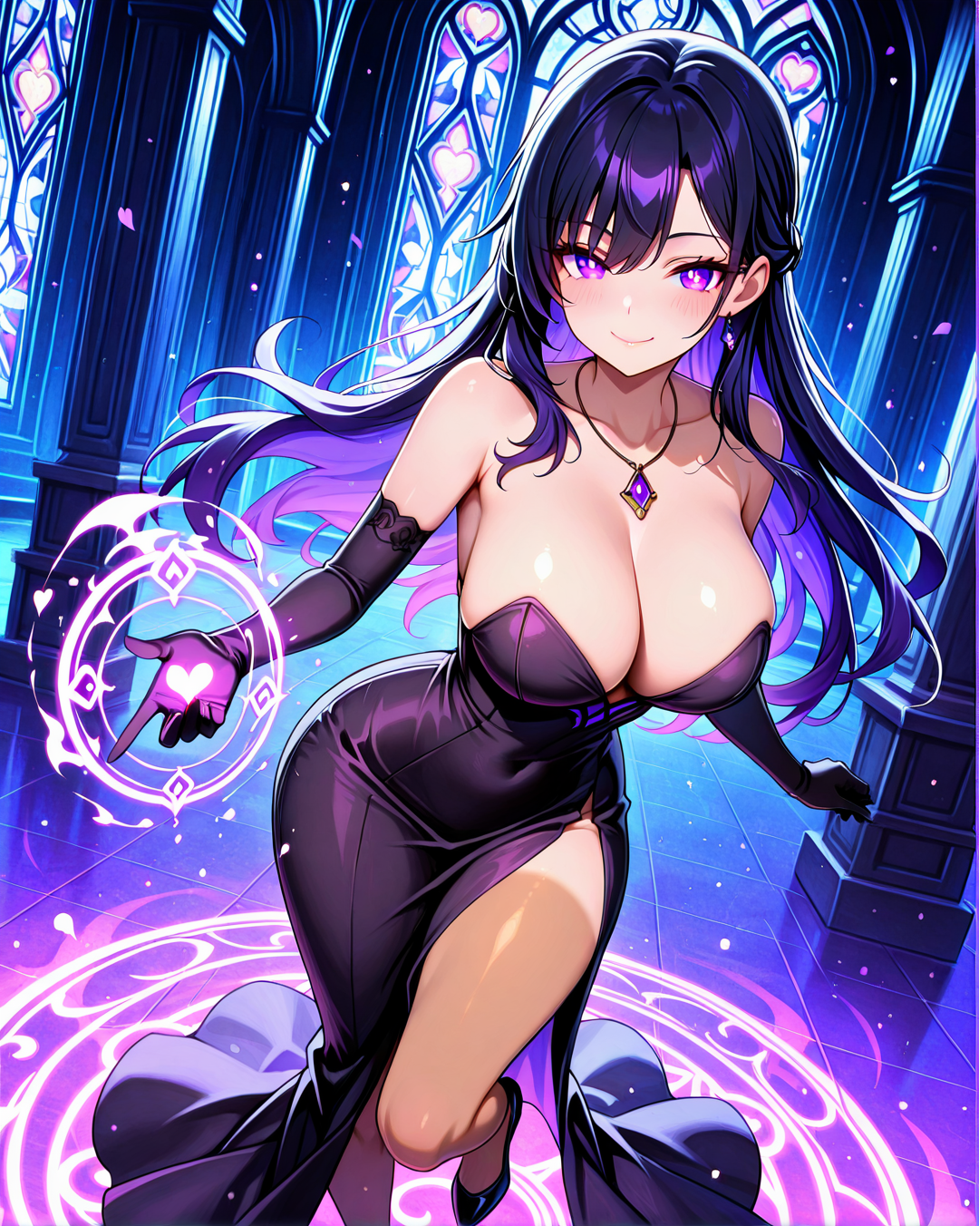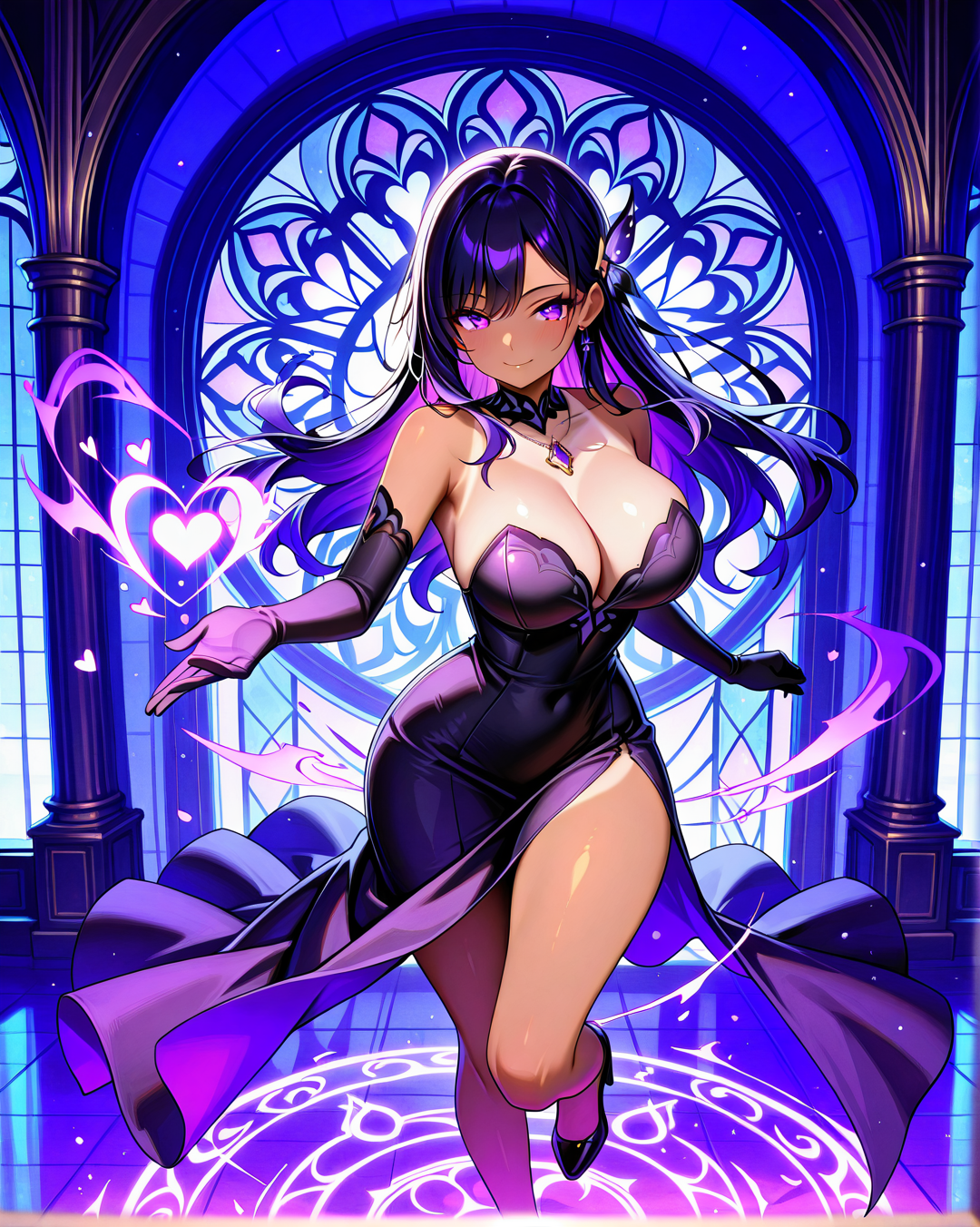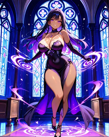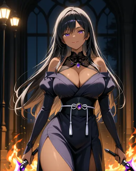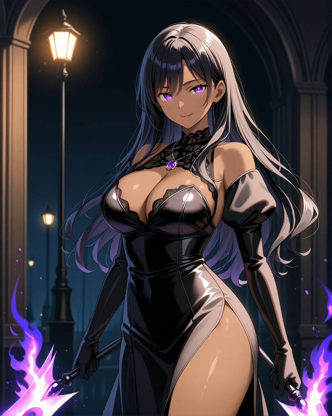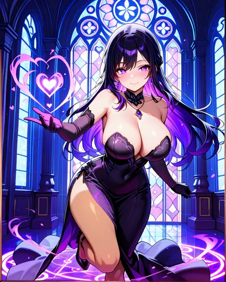 She's usually depicted in a seductive yet agile black bustier dress, perfect for stealth, seduction, or battle. Her signature accessories include a purple gemstone necklace and long gloves, blending gothic and modern femme fatale aesthetics.