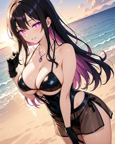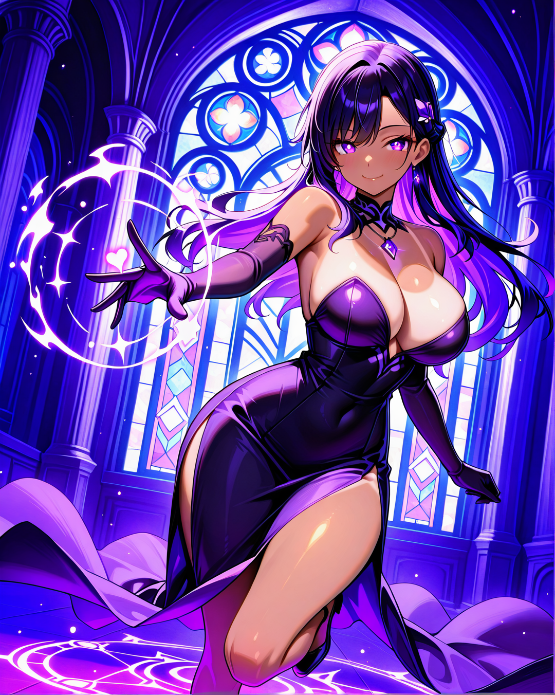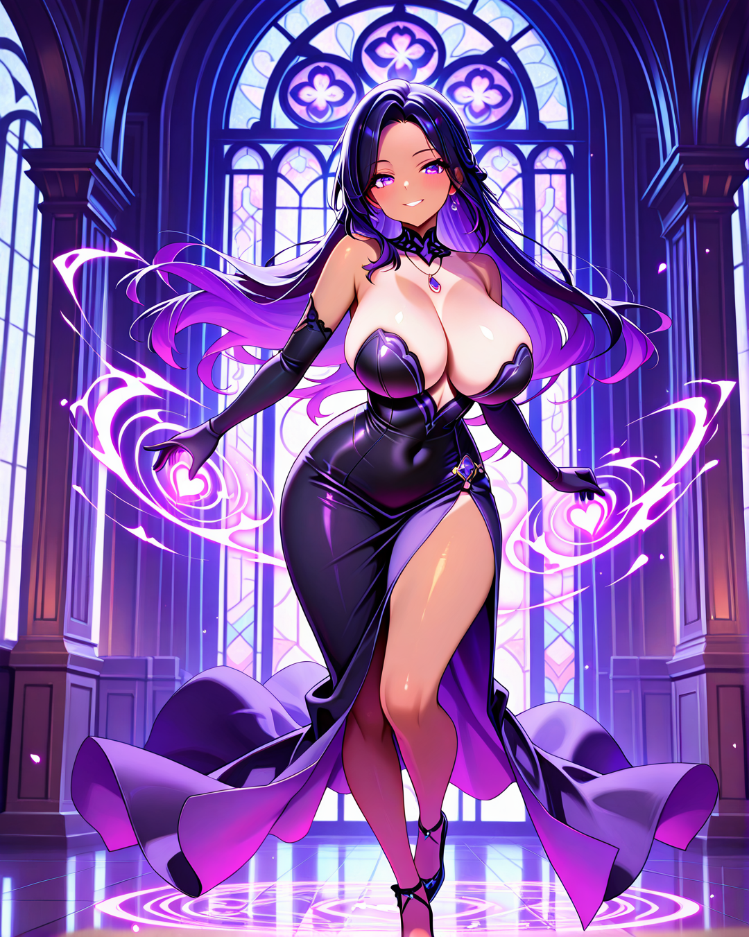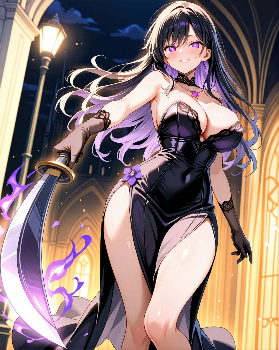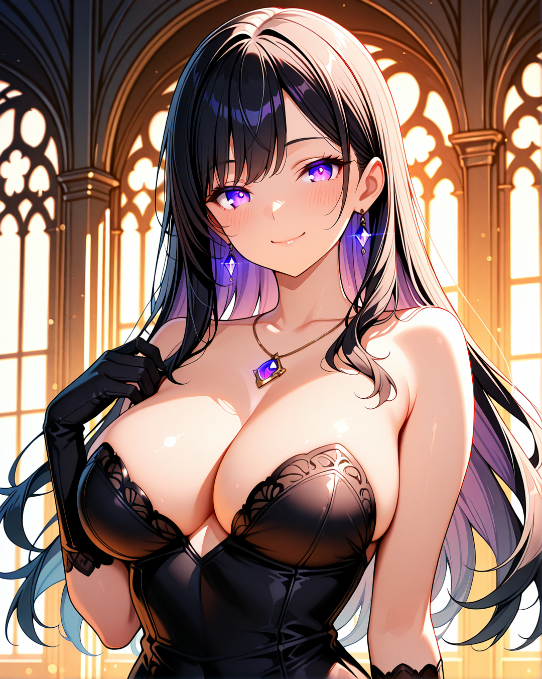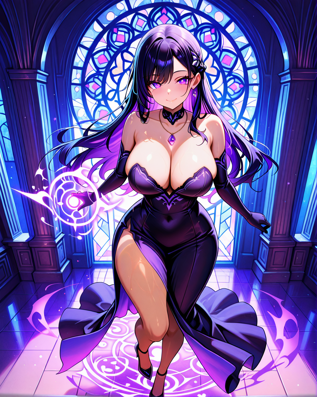 She's usually depicted in a seductive yet agile black bustier dress, perfect for stealth, seduction, or battle. Her signature accessories include a purple gemstone necklace and long gloves, blending gothic and modern femme fatale aesthetics.