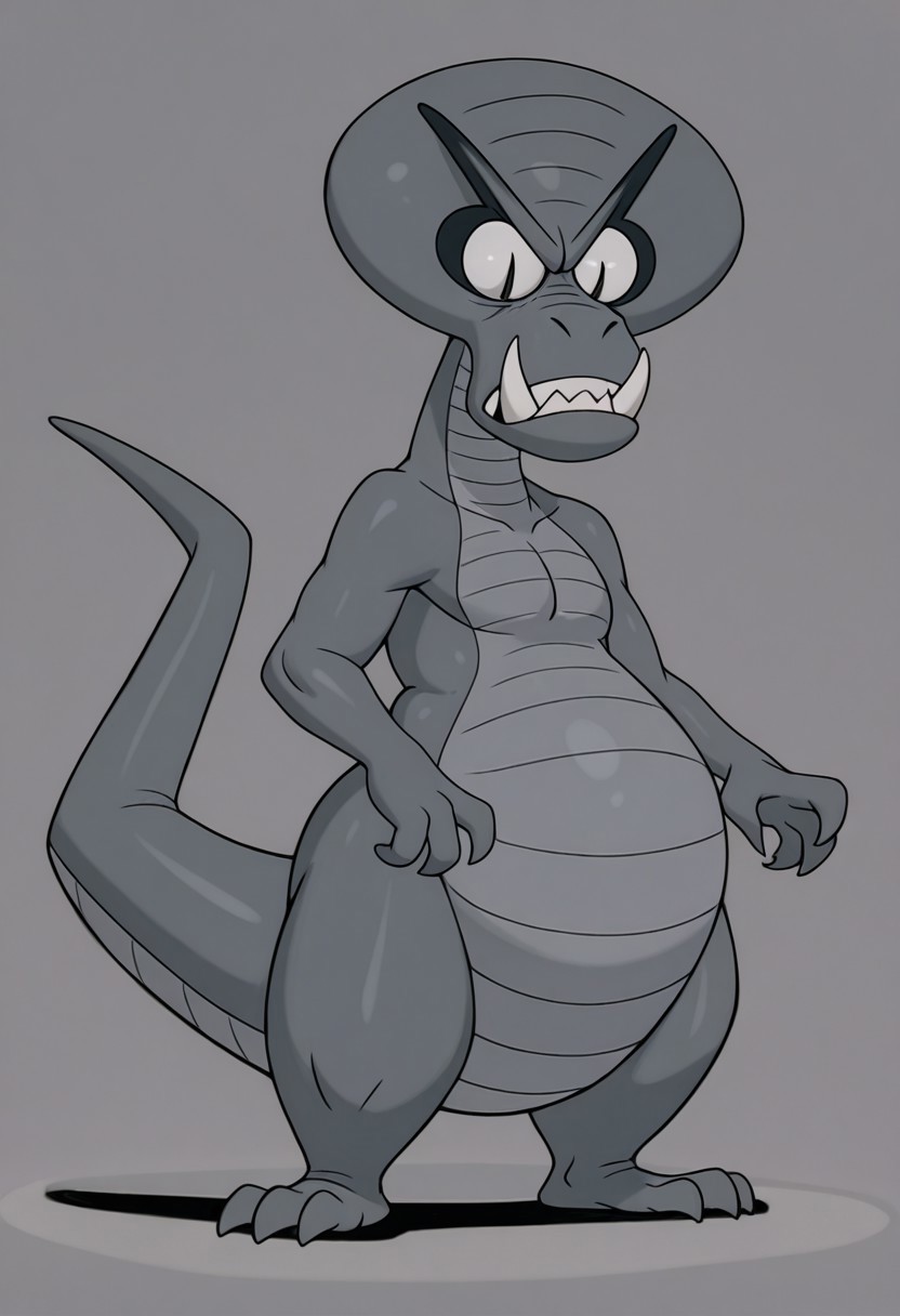 BWalien, alein, dinosaur, large cranium, tusks, slit pupils, gray body, light gray belly, bottom heavy, semi-anthro