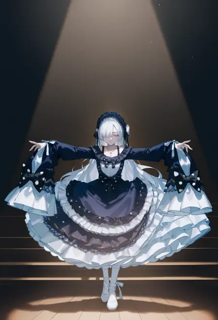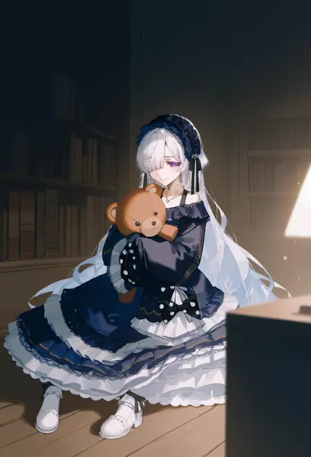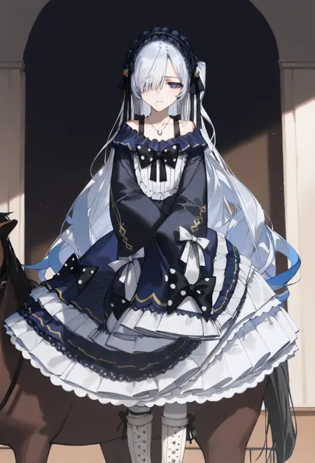 | トレーニングワード | natsumeanan, 1girl, solo,pale skin,purple eyes, white hair, long hair, very long hair, hair over one eye, lolita fashion, gothic lolita, blue dress, frilled dress, off shoulder, long sleeves, wide sleeves, sleeves past fingers, frills, checkered clothes,headwear, hair ornament, hairband, frilled hairband, lolita hairband, black ribbon, neck ribbon, black bow, polka dot bow, jewelry, necklace, white footwear,dress bow,star hair ornament,hair ribbon,layered dressコピーしました! |