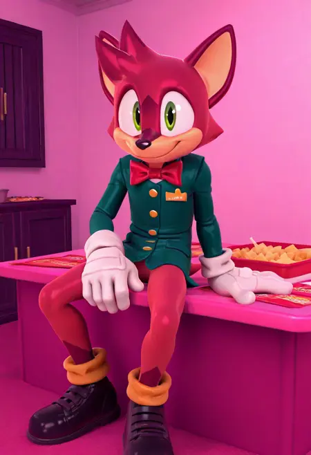 Barry the Quokka, crimson fur, green eyes, tan muzzle, short crimson tail, dark green coat, gold buttons, red bow tie, white gloves, black shoes