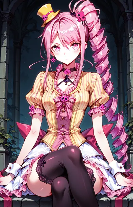 ロンロン、1人女の子、単体、濃いピンクの目、ピンクの髪、非常に長い髪、長い前髪、目の中の髪、不均等な前髪、非対称な前髪、長い側髪、曲がった側髪、サイドポニテール、カールしたポニテール、あほ毛、ミニハット、黄色のミニハット、髪飾り、スペード模様の飾り、スカル模様の飾り、