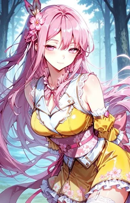 ロンロン、1人女の子、単体、濃いピンクの目、ピンクの髪、非常に長い髪、不均等な前髪、目の中の髪、長い側髪、曲がった側髪、なびく髪、花の髪飾り、羽根の髪飾り、リボンの髪飾り、