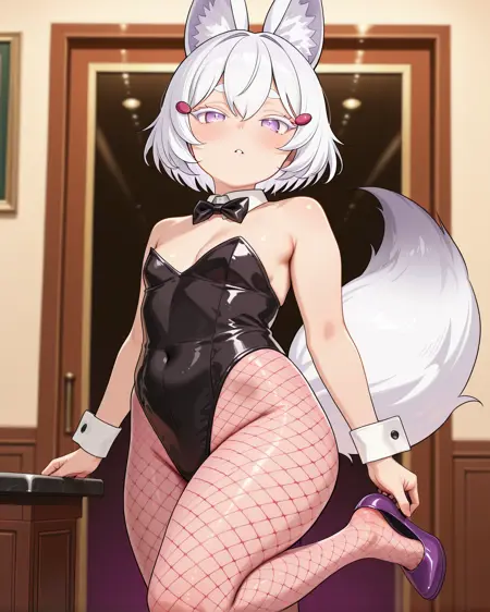 MaEnma, fox girl, short hair, white hair, fox ears, fox tail, white colored eyelashes, purple eyes, hair ornament,
