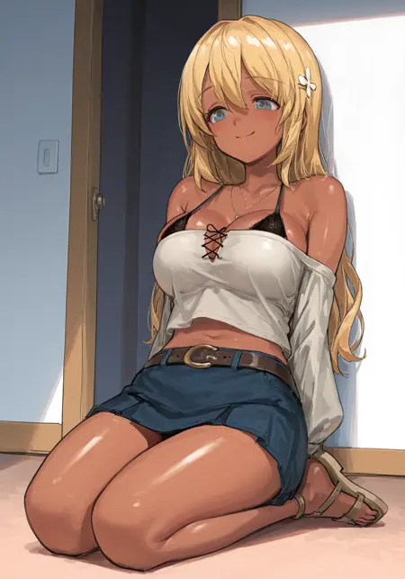 white shirt, bare shoulders,midriff, blue skirt, necklace, belt, sandals
